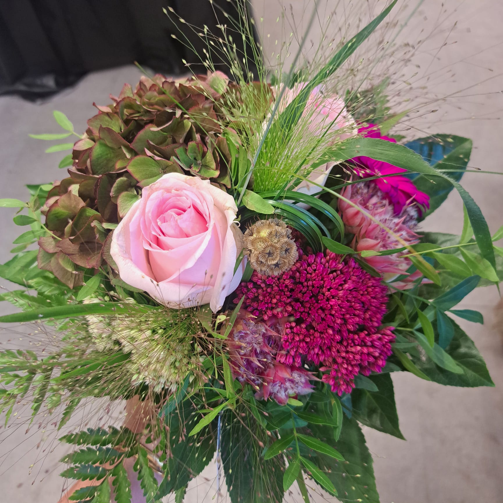 Frisch gebundener Strauß aus Rosen, Hortensien, Sedum, Gerbera und kleinen Prothen.