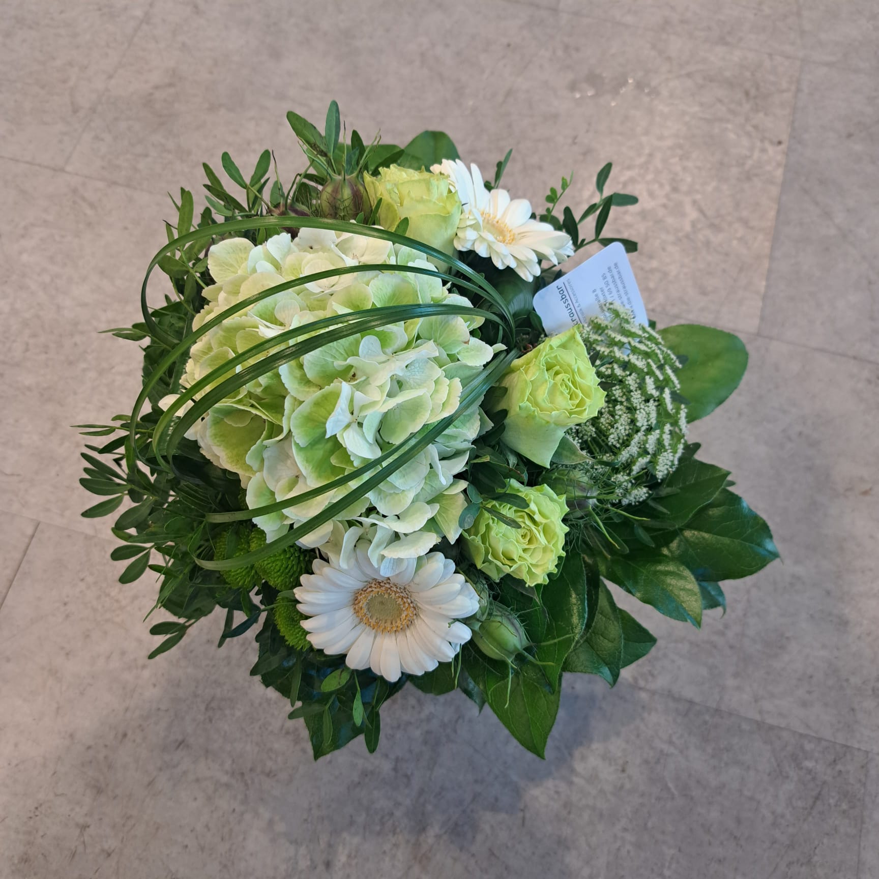 Frisch gebundener Strauß in Grün/Weiß mit Rosen, Hortensien, Gerbera und Ammi